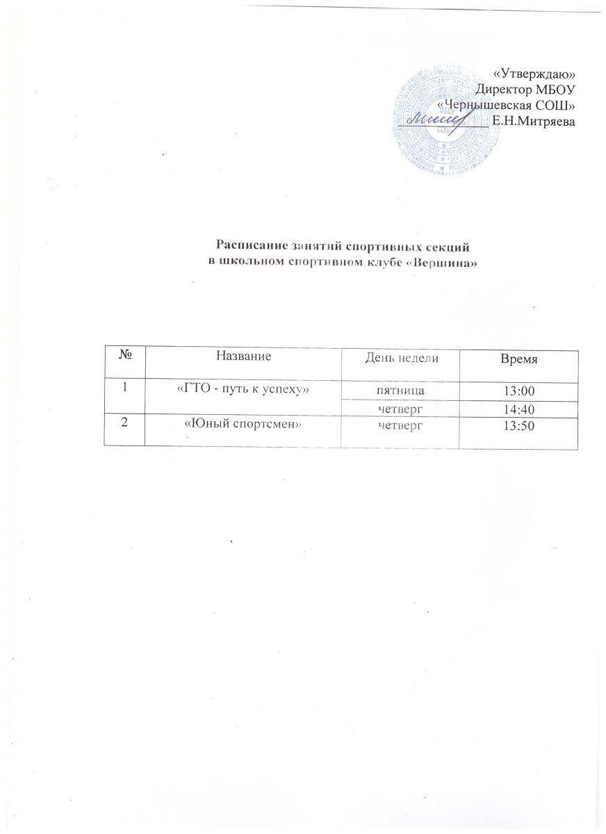 Расписание занятий спортивных секций в школьном клубе "Вершина"