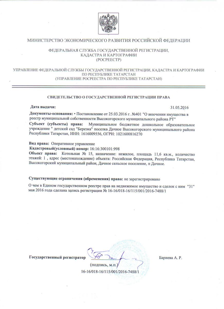 Cвидетельство о государственной регистрации на котельную 2016 г