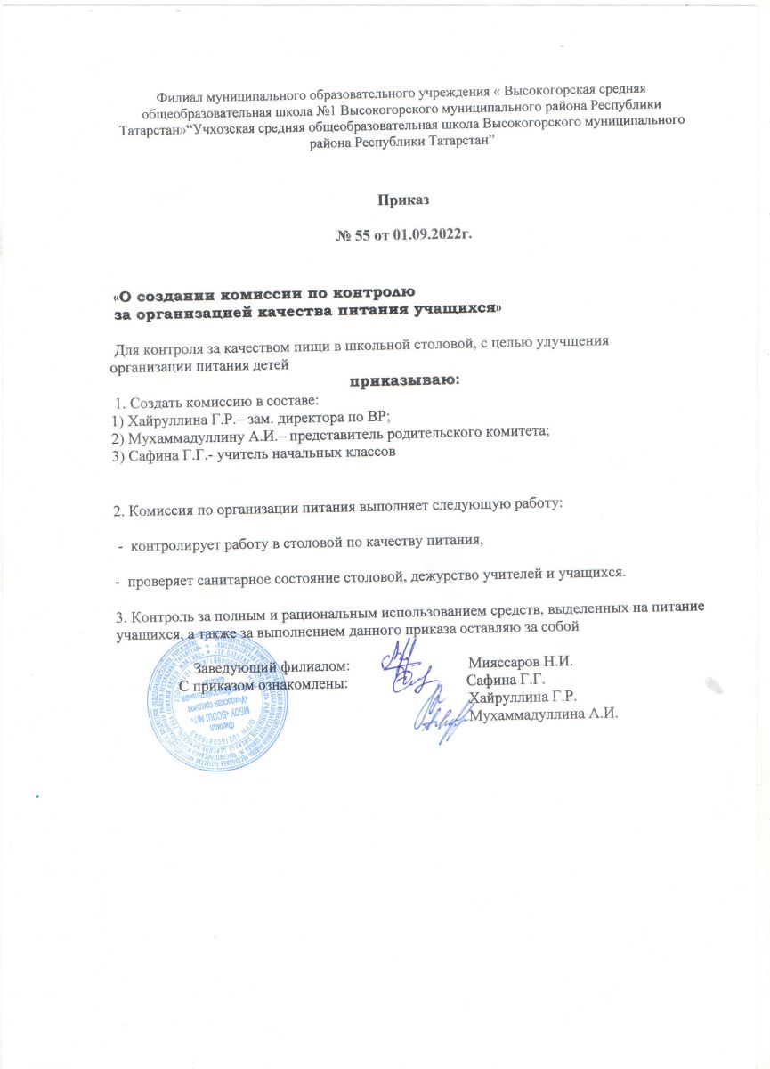Приказ "О создании комиссии по контролю за организацией качества питания учащихся"