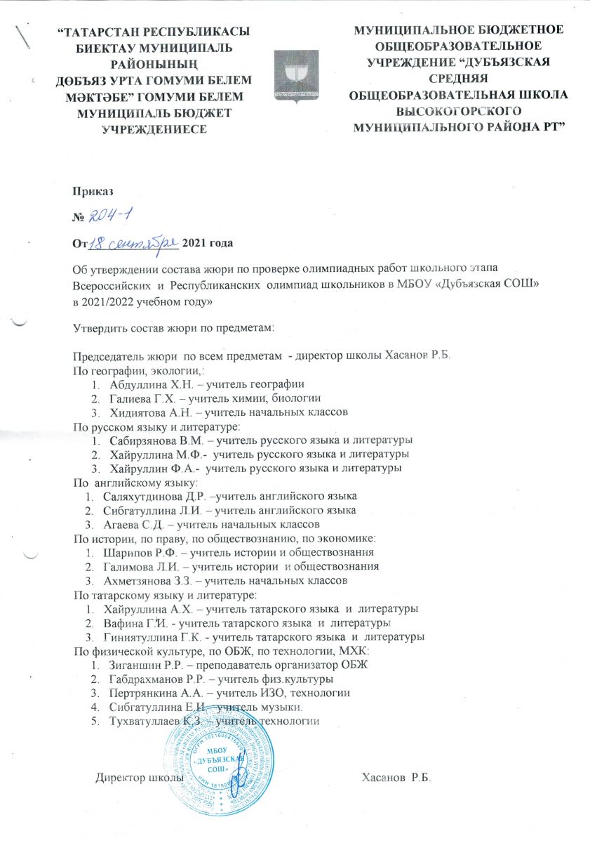 Приказ о проведении ШЭ ВОШ и РОШ в МБОУ "Дубъязская СОШ" в 2021/2022уч.году