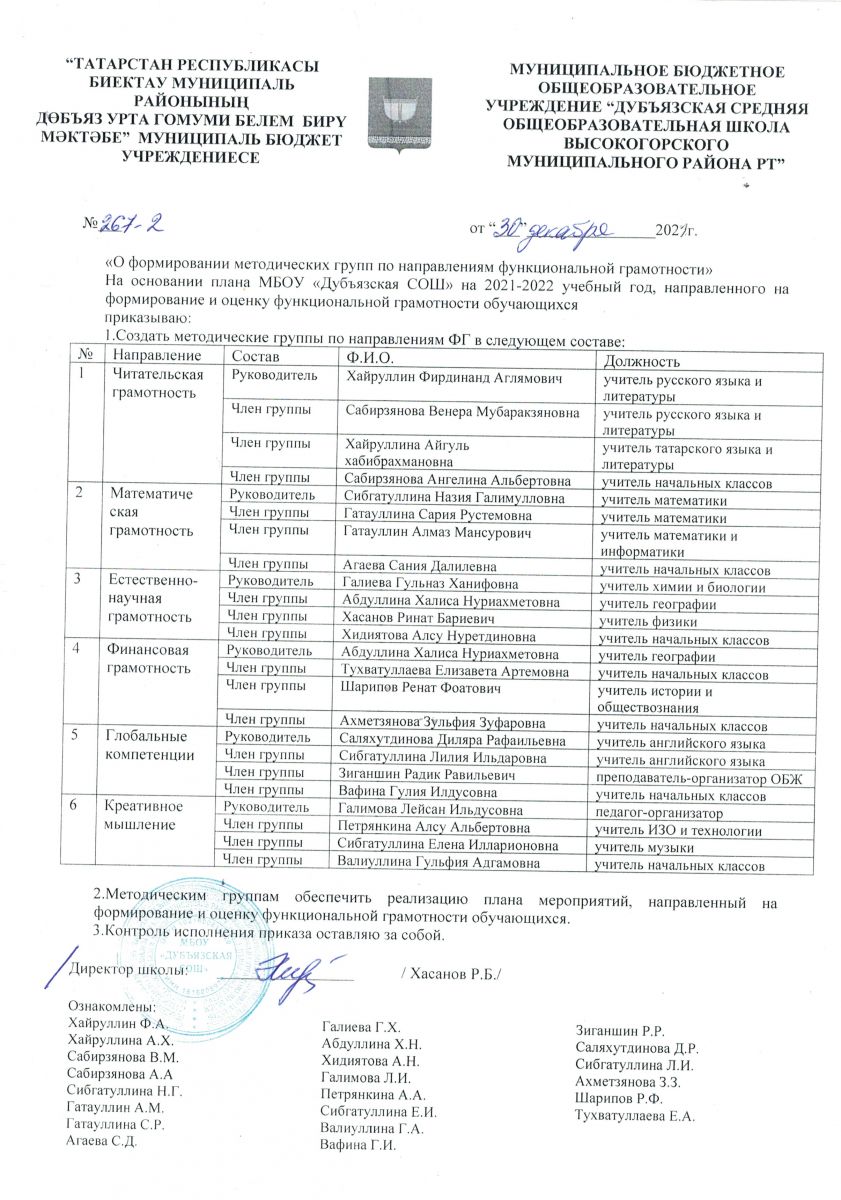 Приказ о формировании методических групп по направлениям функциональной грамотности