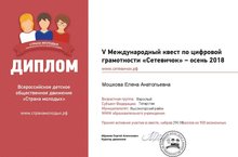 Педагог нашего детского сада Мошкова Е.А. приняла участие в V международном квесте по цифровой «Сетевичок».