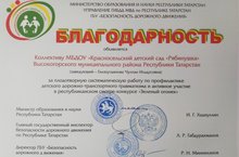 На ежегодной августовской педагогической конференции наш детский сад был награжден благодарственными письмами за плодотворную систематическую работу по профилактике детского дорожно-транспортного травматизма и активное участие в республиканском смотре-конкурсе "Зеленый огонек", а также содействие отделению ГИБДД отдела МВД России по Высокогорскому району