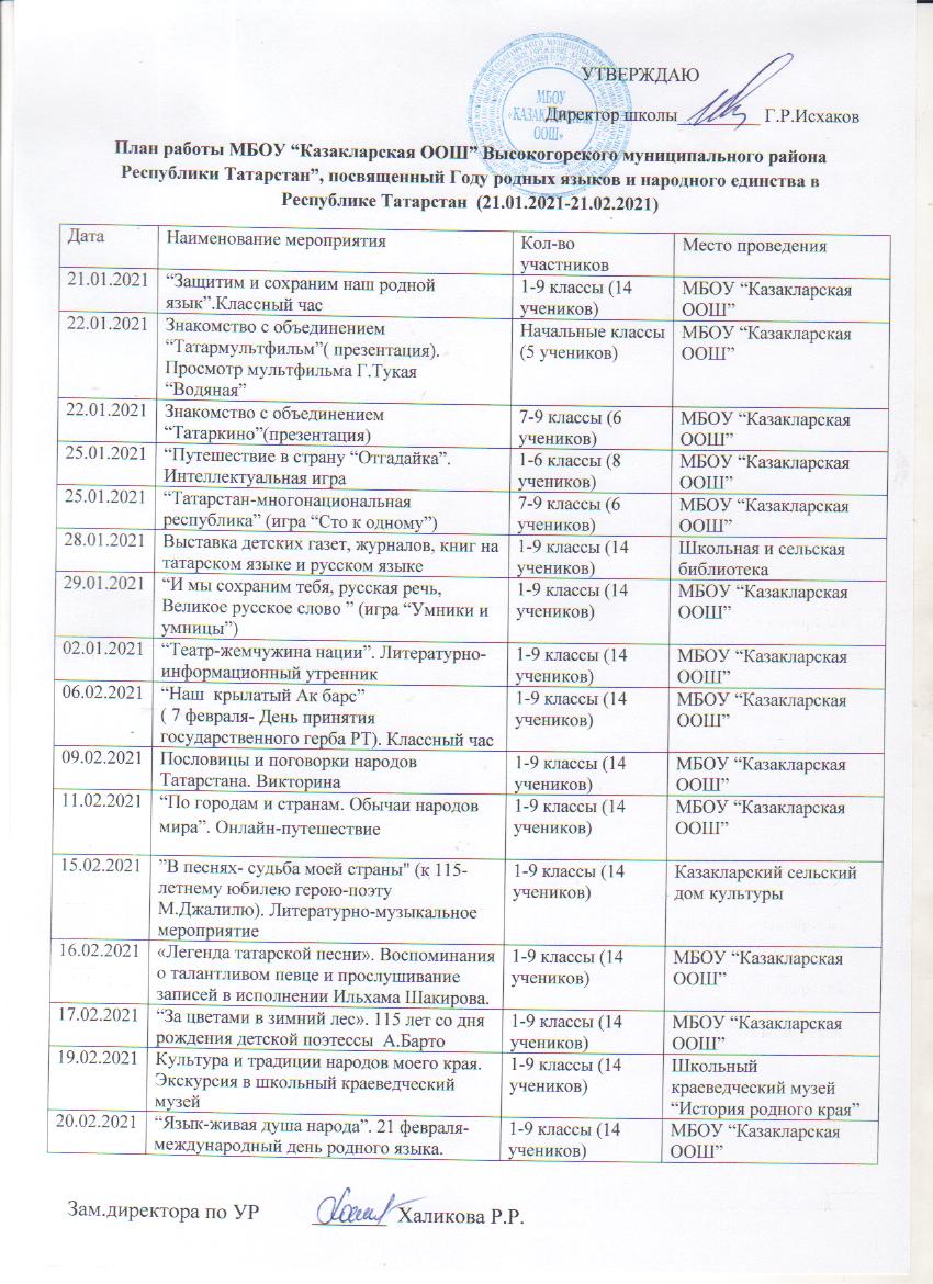 План работы, посвященный году родных языков и народного единства / туган телләр һәм халыклар бердәмлегенә багышланган елына багышланган эш планы