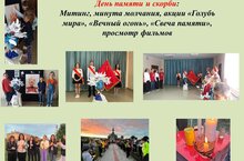 Также прошли различные мероприятия: Урок «Память сердца», Митинг, посвященный Дню памяти и скорби. Акция «Свеча памяти», «Голубь мира», «Вечный огонь», Минута молчания, Работа творческих мастерских, Конкурс рисунков «А мы с тобой войну не знали»