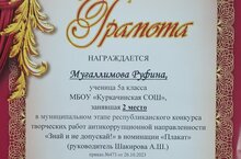 В номинации "Плакат" почетное 2 место было присуждено ученице 5а класса Мугаллимовой Руфине, руководитель Шакирова А.Ш.