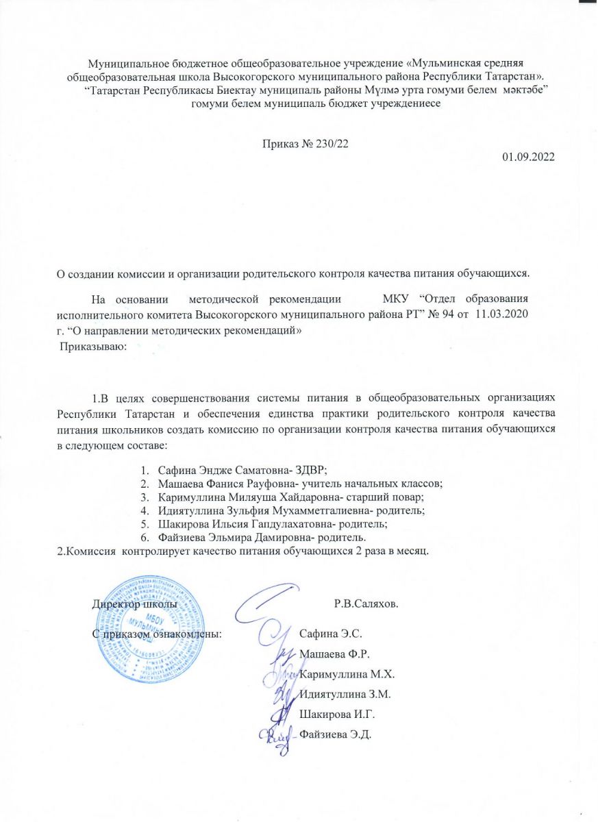 Приказ об организации горячего питания № 229/22 от 01.09.2022