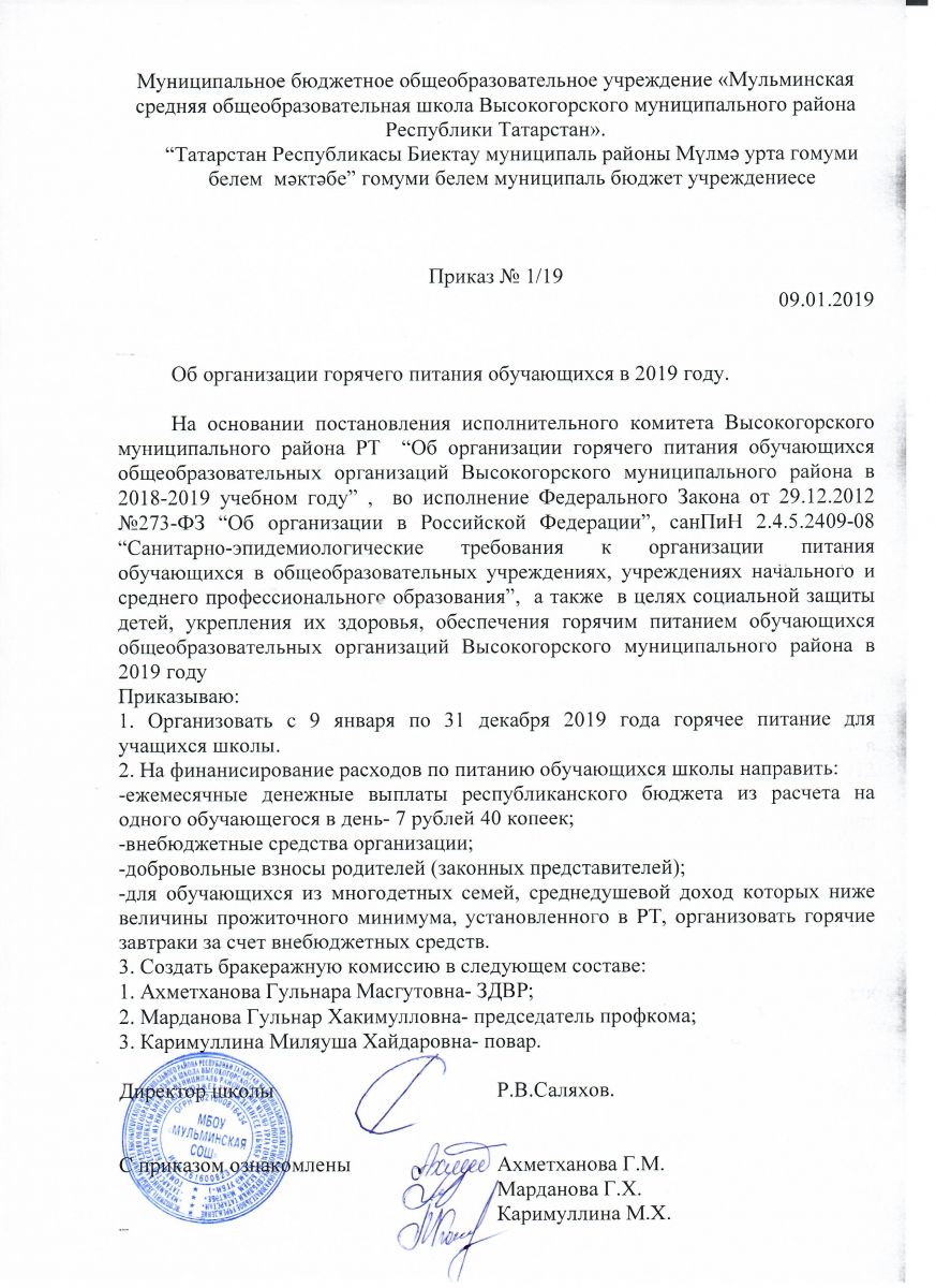 Приказ об организации горячего питания № 1/23 от 09.01.2023