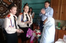 Поздравление труженика тыла с 90 летним юбилеем. Ученики подготовили стихи и песни, сделали своими руками букет роз из бумаги. Рук: Марданова Г.Х. 10.04.2019