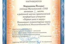 7 нче класс укучысы Марданова Йолдыз "Первые шаги в науку" район конференциясендә, "Гуманитар фәннәр" номинациясендә 1 нче урынны алды. Җитәкчесе Мингазетдинова Розалия Файзрахмановна. Чын куңелдән Йолдызны һәм Розалия Файзрахмановнаны бу уңышы белән котлыйбыз! 01.02.2017