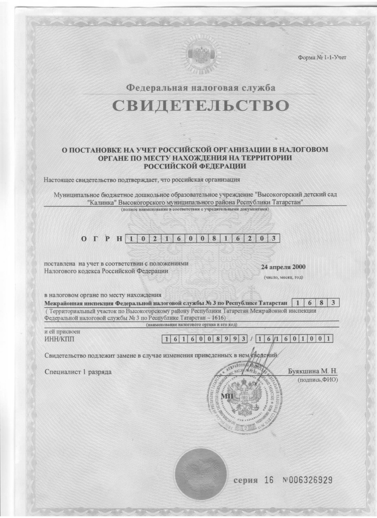 Свидетельство о постановке на учет в налоговом органе