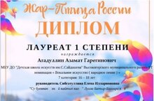 Агадуллин Азамат и Низамиева Илюза приняли участие в Международном фестивале "Жар-птица" и завоевали почётные места, желаем им дальнейших успехов и новых достижений.