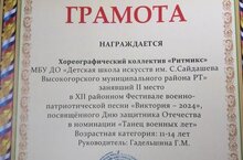 Учащиеся хореографии под руководством Гадельшиной Г. М. заняли 2 место в муниципальном этапе республиканского конкурса военно-патриотической песни "Виктория" в номинации "Танец военных лет"! Молодцы! Поздравляем!