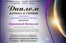 Поздравляем Гарипову Камиллу, ученицу по классу вокала( преподаватель Кареева О.В.), ставшую Лауреатом II степени на Международном конкурсе "Ярче звёзд"! Молодец! Так держать!