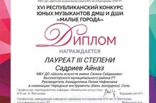 Поздравляем Садриева Айназа, учащегося по классу баян с Дипломом Лауреата III степени XVI Республиканского конкурса юных музыкантов ДМШ и ДШИ "Малые города", проходившего в г. Елабуга.
