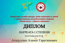 Поздравляем Агадуллина Азамата и его преподавателя по классу вокала Сибгатуллину Елену Илларионовну с очередной победой. Азамат стал Лауреатом I степени Творческого онлайн - конкурса среди инвалидов и людей с органиченными возможностями здоровья "Омет юлы - Дорога надежды".