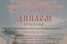 IV Всероссийский фестиваль - конкурс оркестров и ансамблей национальных инструментов народов России "Многоликая Россия". Поздравляем инструментальное трио "На волне" преподавателей школы искусств: Гафурову Эндже Талгатовну, Сибгатуллина Ильгама Илгизовича, Фатхутдинову Татьяну Геннадьевну с Дипломом I степени. Желаем новых побед и творческих свершений!