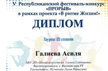 Поздравляем Галиеву Асилю и преподавателя Нугманову Лилию Идрисовну с Дипломом Лауреата III степени в V Республиканском фестивале - конкурсе "Прорыв" в рамках проекта "В ритме жизни!" Желаем новых творческих побед!!!