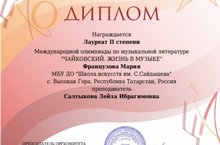 Поздравляем Французову Марию (преподаватель Салтыкова Л. И.), ставшую Лауреатом II степени в Международной олимпиаде по музыкальной литературе "Чайковский. Жизнь в музыке".