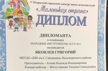 Поздравляем Яковлева Григория (кл. преп. Агеева Н.В., концертмейстер Фатхутдинова Т.Г.), ставшего Дипломантом на V Открытом городском конкурсе юных исполнителей "Маленькая страна". Молоцы!!! Желаем дальнейших творческих побед!!!