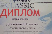 В г.Казани прошел Международный конкурс исполнительского искусства в котором учащаяся Хусниярова Арина (класс преподавателя Гильмановой Г.З.) стала дипломантом III степени. Наши сердечные поздравления и пожелания успехов в творчестве!