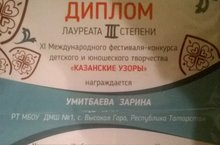 В Казани прошел ХI Международный фестиваль конкурс детского и юношеского творчества "Казанские узоры", в котором ученица Умитбаева Зарина класса ИЗО преподавателя Усмановой Р.Г. стала лауреатом 3 степени. Мы поздравляем с достижениями и желаем дальнейших успехов в творчестве!