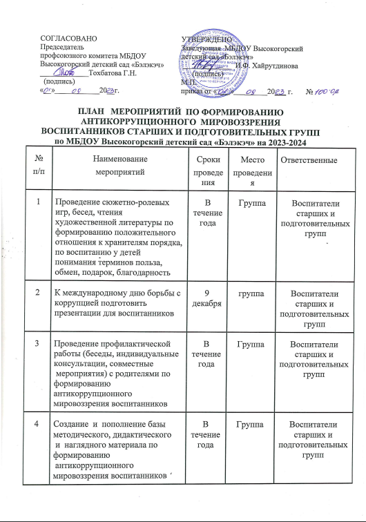 План мероприятий по формированию антикоррупционного мировоззрения у детей на 2023-2024 учебный год