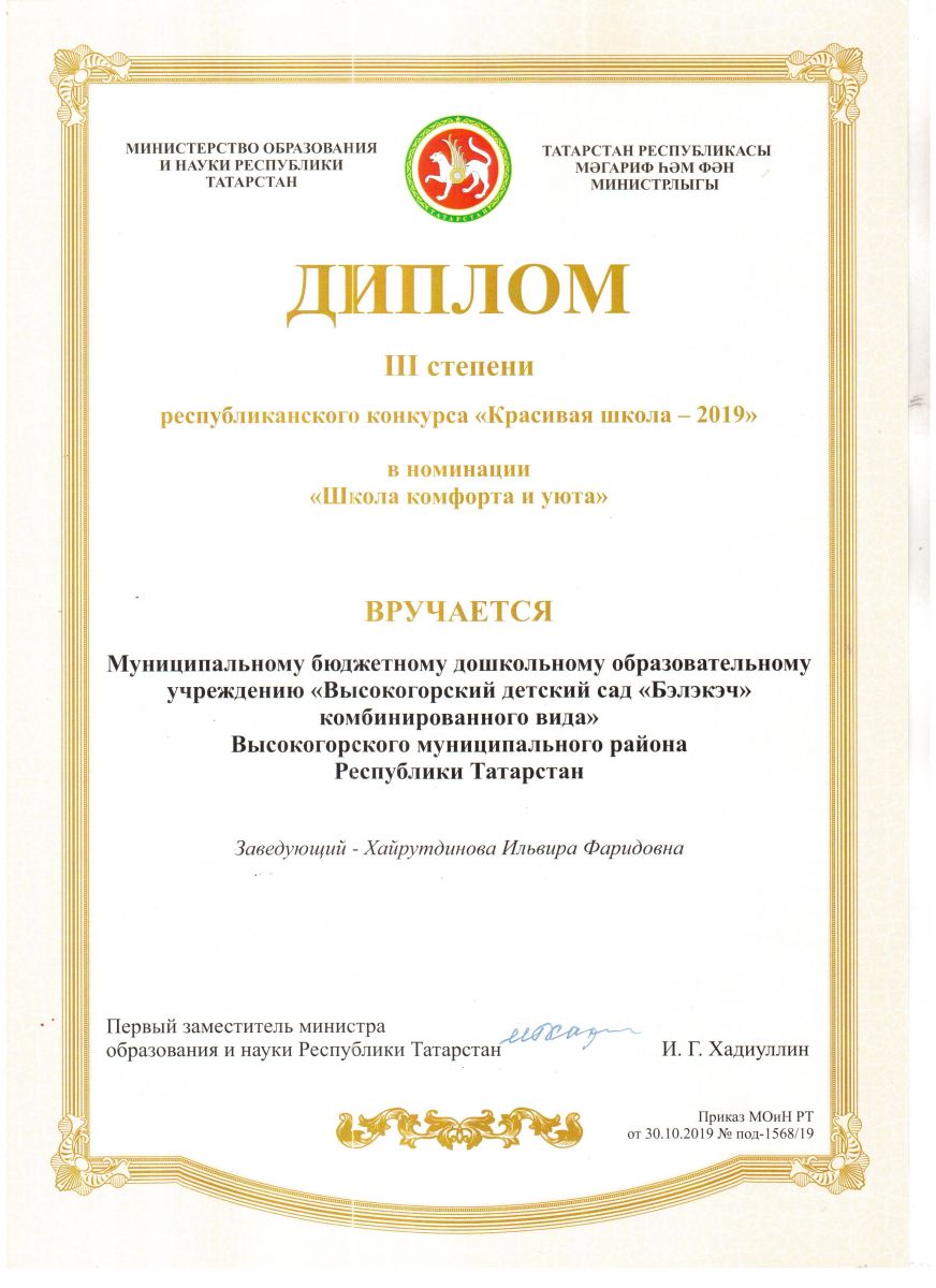 Диплом III степени в республиканском конкурсе "Красивая школа - 2019"