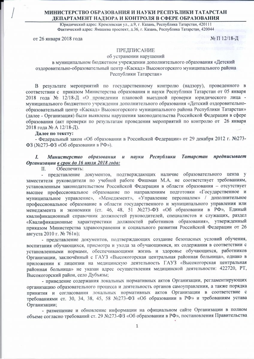 Отчет по предписаниям-2018, ДООЦ Каскад