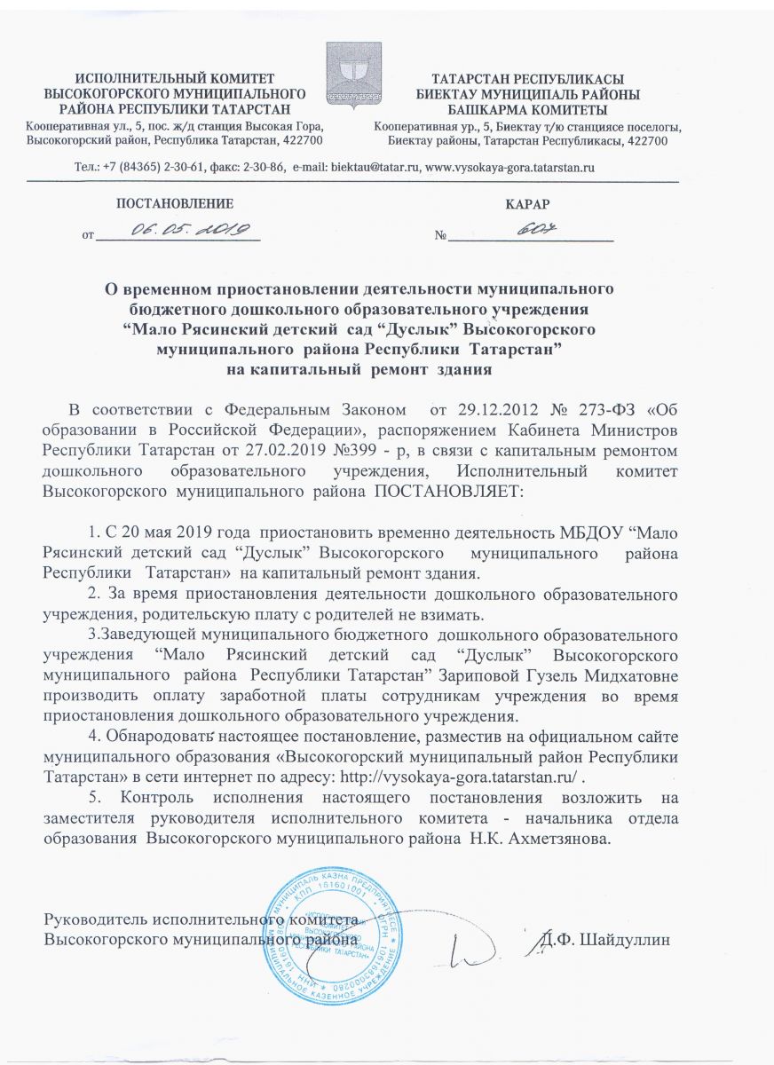 Муниципальное бюджетное дошкольное образовательное учреждение «Мало Рясинский детский сад "Дуслык" Высокогорского муниципального района РТ" / "Татарстан Республикасы Биектау муниципаль районының "Кече Рәс"Дуслык" балалар бакчасы " мәктәпкәчә белем бирү муниципаль бюджет учреждениесе.