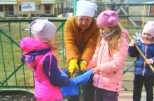 Ребята вместе с воспитателями убирают мусор на участке ДОУ.