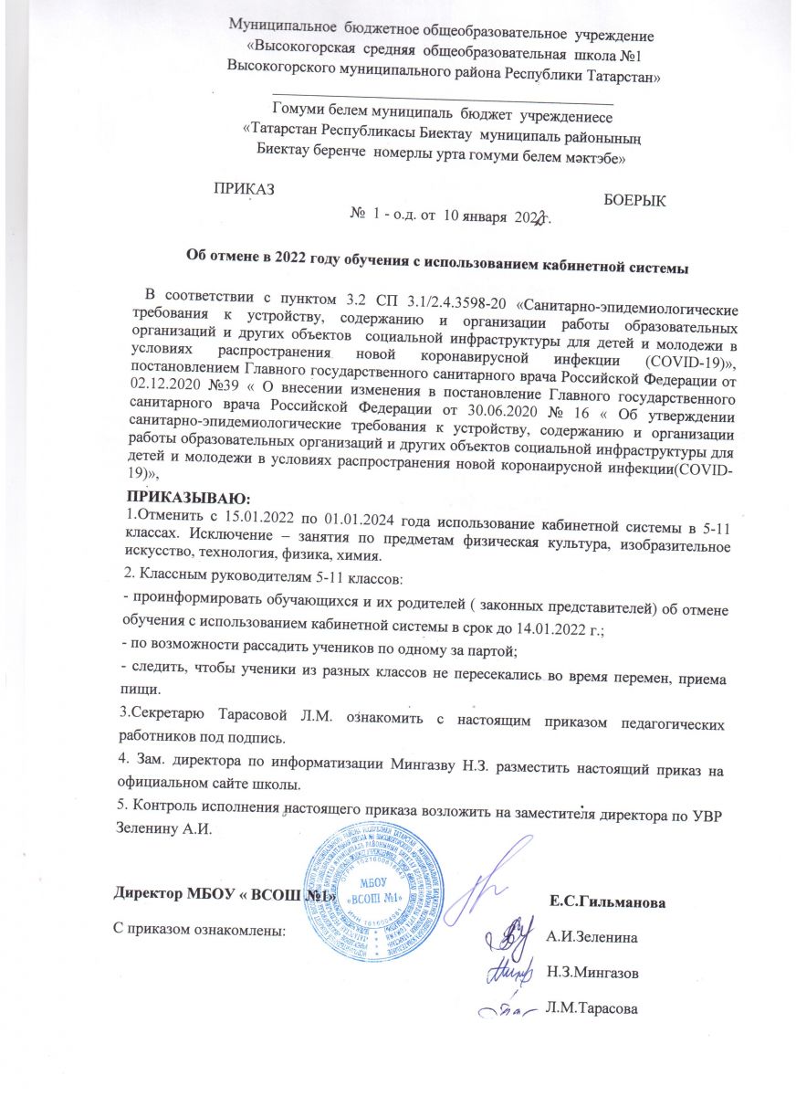 Приказ Об отмене 2022 году обучения с использованием кабинетной системы
