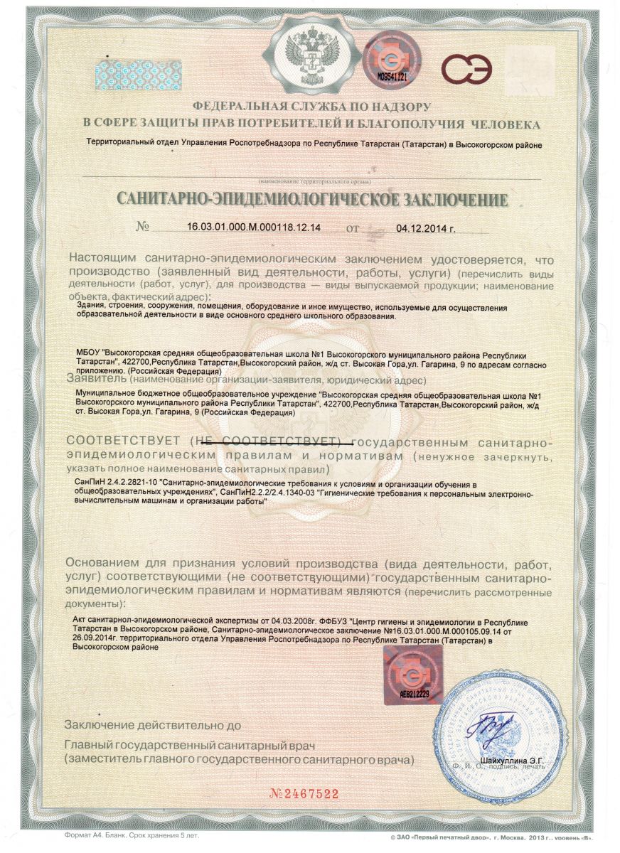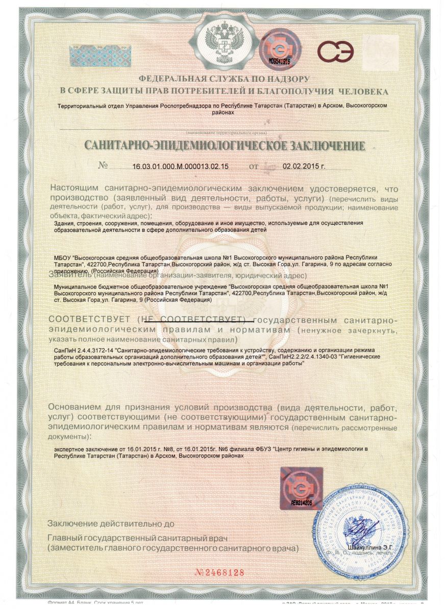 Санитарно - эпидеомиологическое заключение 2014 г.