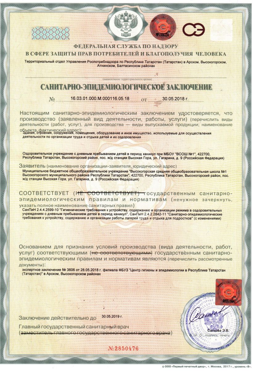 САНИТАРНО-ЭПИДЕМИОЛОГИЧЕСКОЕ ЗАКЛЮЧЕНИЕ ОТ 30.05.2018 Г.
