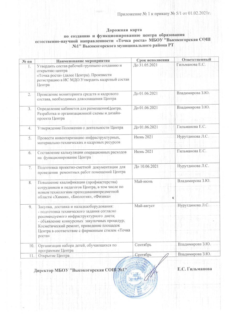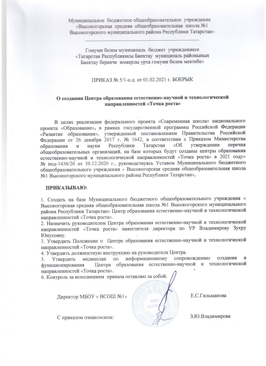 Приказ №5/1-о.д. от 01.02.2021г. О создании Центра образования естественно-научной и технологической направленностей "Точка роста"