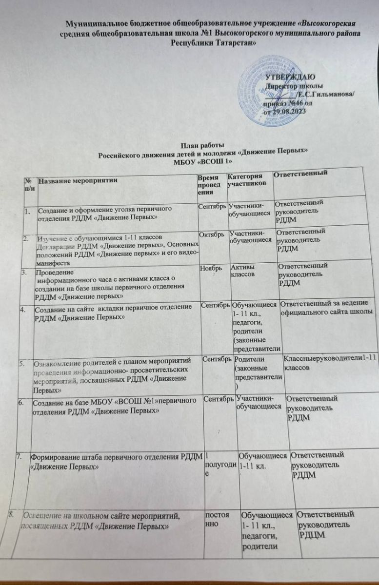 План работы первичного отделения РДДМ Движение первых.