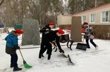 Яшь армиячеләр мәктәп ишегалдындагы һәйкәлне кардан чистарттылар.