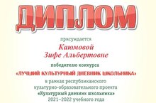 Поздравляем ученицу 3б класса Высокогорской школы №3-Каюмову Зифу, ставшей победителем муниципального конкурса «Культурный дневник школьника». Молодец, Зифа! (Классный руководитель Маняпова Л.В.)