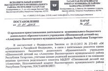 Постоновления о временном приостановления деятельности муниципального бюджетного дошкольного образовательного учреждения "Шапшинский детский сад "Аленушка" Высокогорского муниципального района