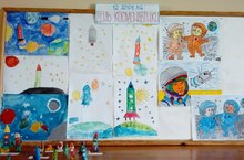 Ко Дню Космонавтики была оформлена выставка рисунков учащихся начальных классов