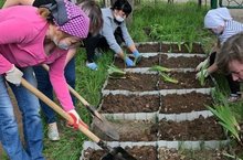 Сотрудники детского сада приводят в порядок клумбы на территории детского сада.