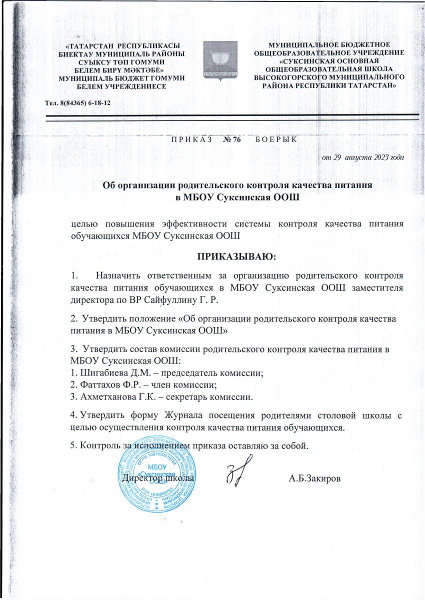 Приказ о создании комиссии по осуществлению контроля за качеством питания в 2022-2023 учебном году