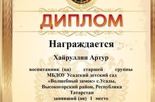 25 ноября 2013 года воспитанники старшей группы детского сада получили Дипломы за 1 призовые места во Всероссийком дистационном конкурсе по рисованию: "Маленький художник. Осень". Поздравляем ребят с победой в конкурсе, желаем дальнейших побед в конкурсах! Воспитателю Газизовой Альбине Эльдаровне выражаем благодарность и желаем успехов в педагогической деятельности!