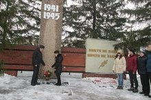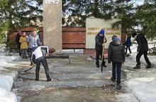 Учащиеся школы очистили территорию Памятника павшим героям в годы ВОВ от льда.
