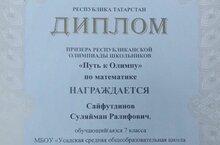 Поздравляем Сайфутдинова С., ученика 7 класса, призёра РЕСПУБЛИКАНСКОЙ ОЛИМПИАДЫ школьников "Путь к Олимпу". Учитель Галиулина Г.Р. Молодцы!!!