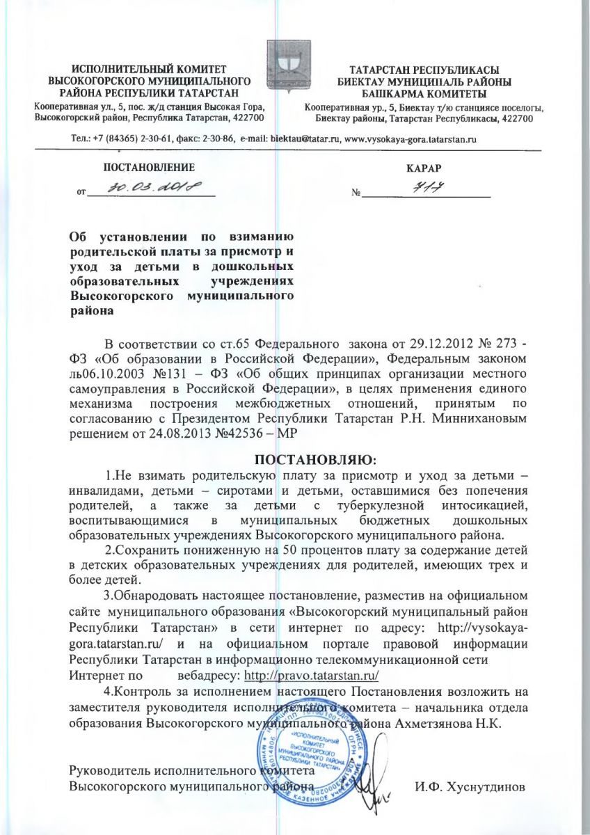 Постановление №420 от 21.05.2020 "О родительской плате в дошкольных образовательных учреждений Высокогорского муниципального района Республики Татарстан"