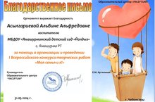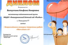 "Минем гаиләм һәм мин" бөтенроссия рәсем конкурсында катнашып мәктәпкә хәзерлек төркемендә тәрбияләнүче Валиуллина Әлфинә лауреат дипломы алды. Уңышы белән котлыйбыз!