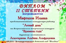"Ел фасыллары" дигән бөтенроссия иҗади конкурсында "Җәйге көн"дигән кул эше белән катнашып мәктәпкә әзерлек төркемендә тәрбияләнүче Мифтахов Илназ икенче урын алды.Тәрбиячесе Асылгариева Альбинаны һәм Илназны уңышлары белән котлыйбыз!!!