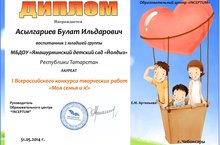 Икенче кечкенәләр төркемендә тәрбияләнүче Асылгариев Булат бөтенроссия "Мин һәм минем гаиләм" фото конкурсында катнашып лауреат дипломы алды. Уңышы белән котлыйбыз!!!