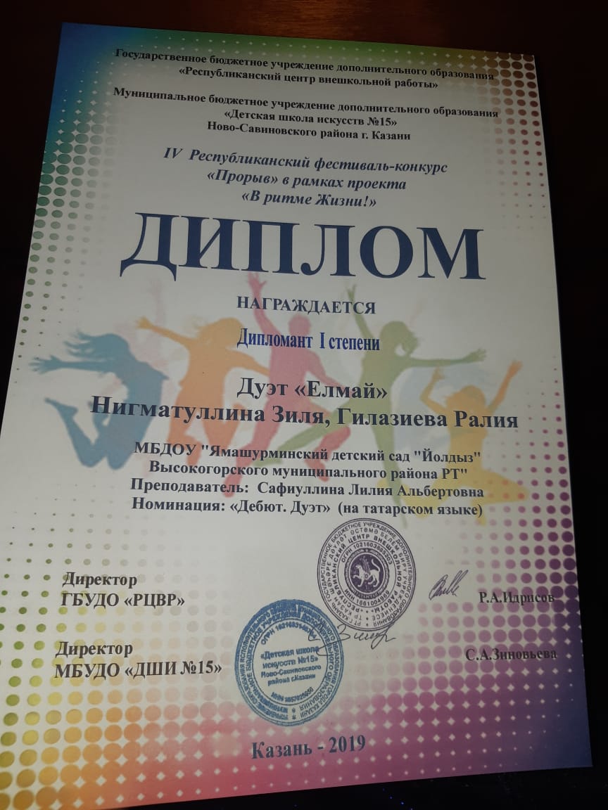 - дуэт “Елмай” воспитанники подготовительной группы Гилазиева Ралия и Нигматуллина Зиля – Лауреатом I степени.